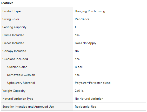 Fun and indulgent, this wooden outdoor hanging chair is a charming addition to a patio, porch, or balcony. It features a sturdy and durable steam-bent wood frame inspired by a classic lobster tail shape that cradles the body for ultimate comfort as you enjoy summer shade or a bit of warm spring sunshine. Its thick, ultra-plush foam cushion is wrapped in polyester fabric in a soft red as this hanging outdoor chair sways in the breeze to rock you into soothing relaxation.What's Included?